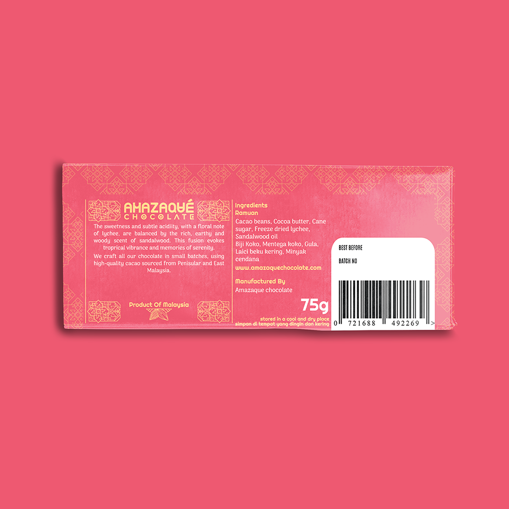 Cacao Beans, Cocoa Butter, Cane Sugar, Freeze Dried Lychee, Sandalwood Oil